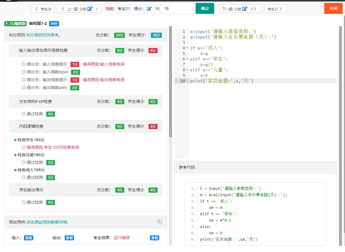一、Java、Python类的智能评阅:包含测试用例的输入输出检查、以及基于代码本身的检查, 使用得分规则类分割题目要求的得分,帮助教师快速审查学生代码,提交教师批改效率。同时,对 于学生做了智能AI的返回错误解析,引导学生学习作答。